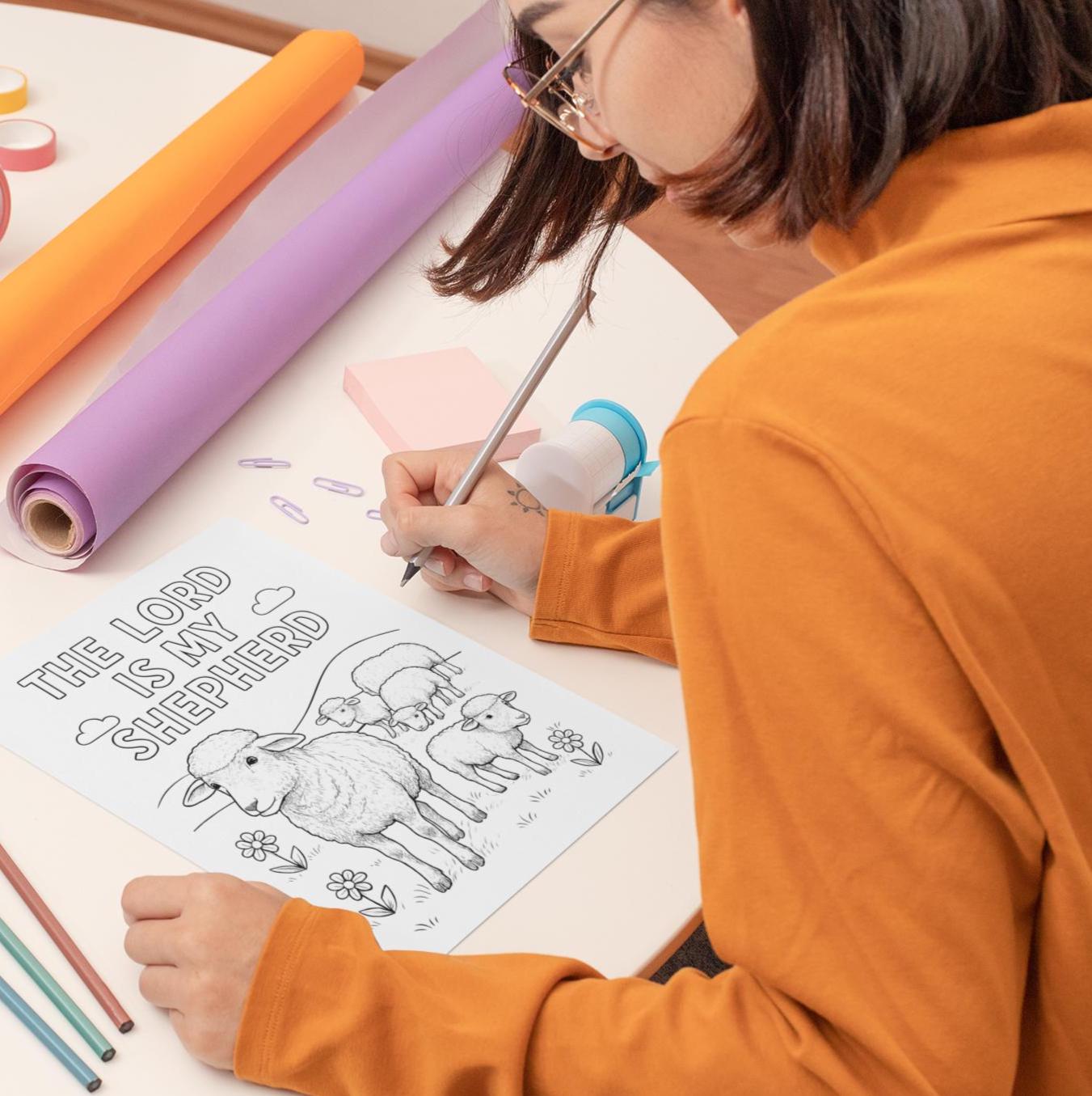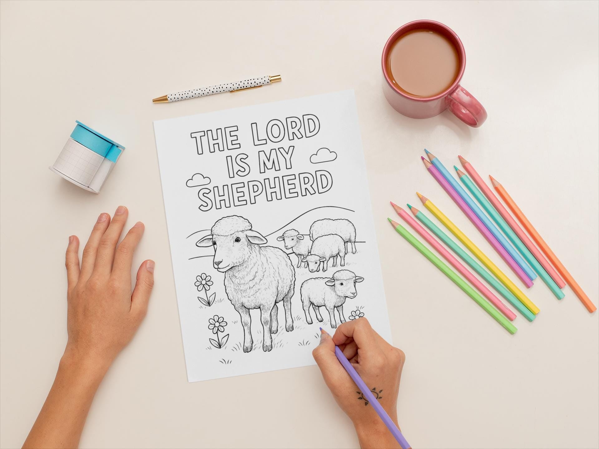 Bring peace and comfort to your quiet time with this heartwarming Psalm 23-inspired coloring page. Featuring a serene pastoral scene with gentle sheep, blooming flowers, and rolling hills, this printable artwork beautifully illustrates the beloved verse: “The Lord is my Shepherd.”